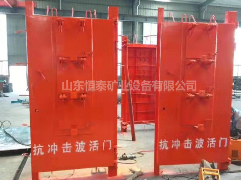 抗冲击波门由抗冲击波活门和抗冲击波密闭门组成,用于井下材料库和材料发放硐室,起隔离作用阻止冲击波及产生的火焰、有毒气体向外部巷道扩散,由总回风道排出。抗冲击波活门起抗冲击波、调节库房所需风量和隔离作用。